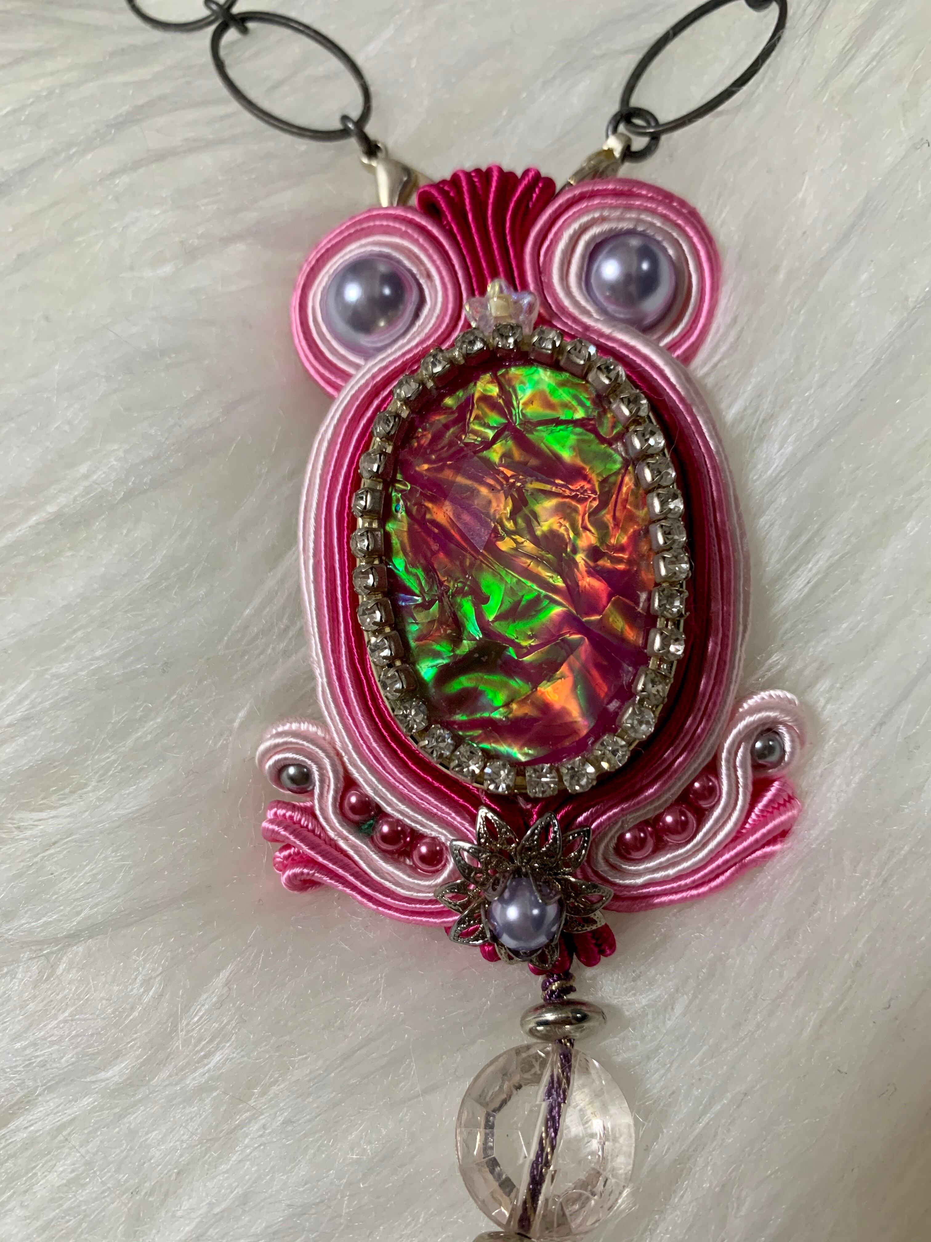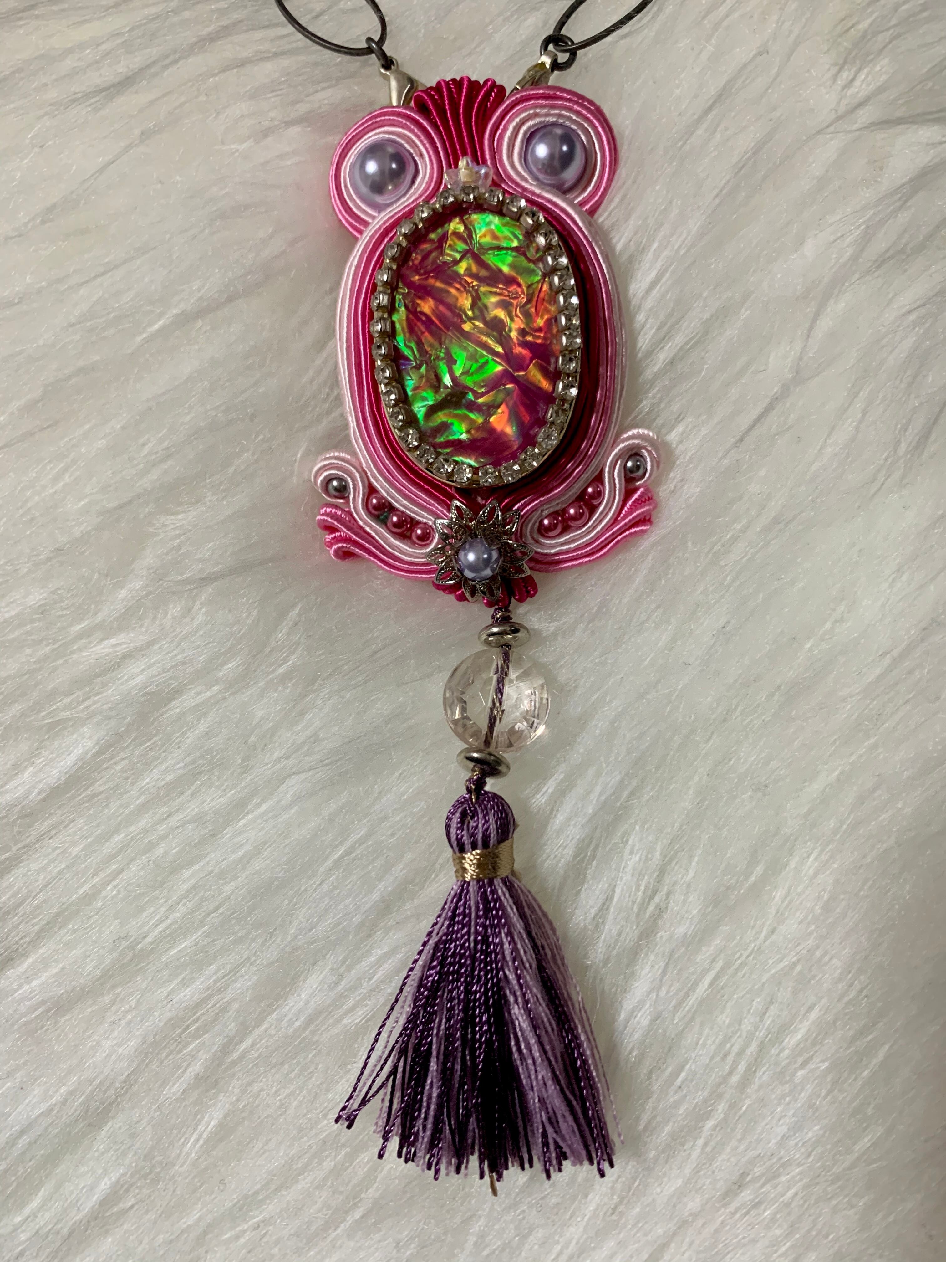 職人技ありの完全オリジナルハンドメイド。ハイクオリティで丁寧な仕上がりとお洒落なデザイン性は他にない1点ものです。首のロープ部分は後ろでリボンにできるのでお好みの長さに調整可能です。ペンダントトップはブローチにもなります。