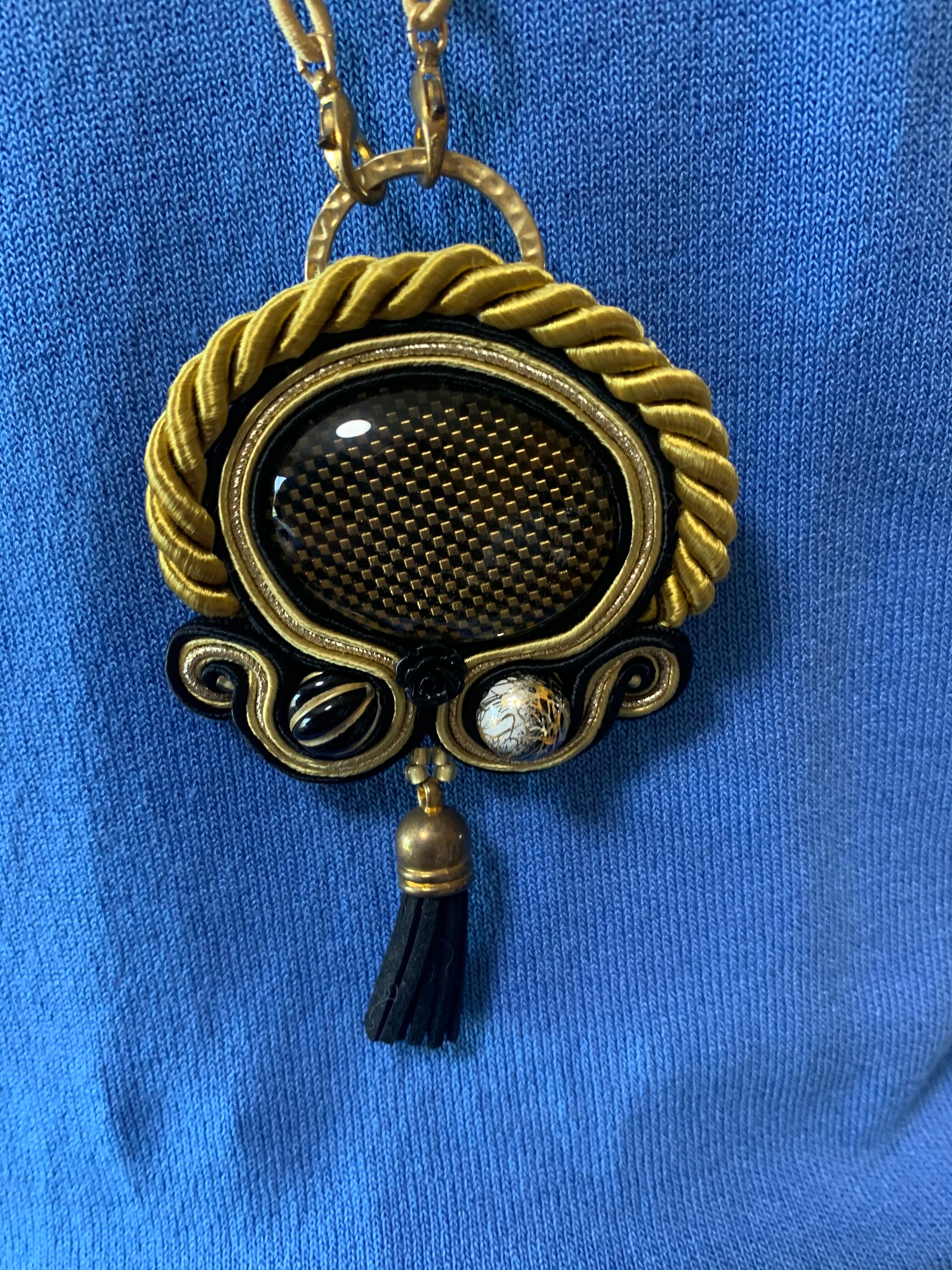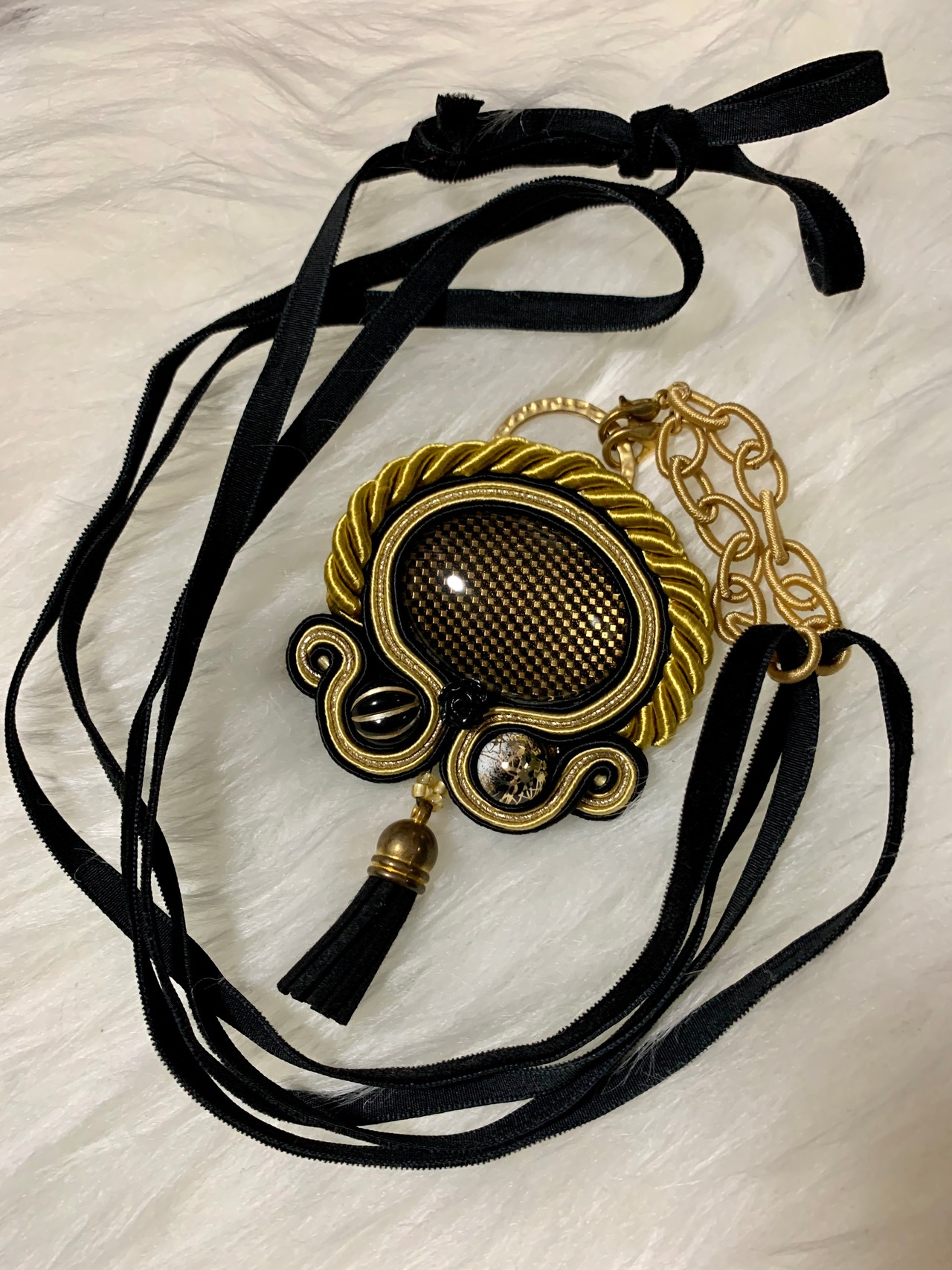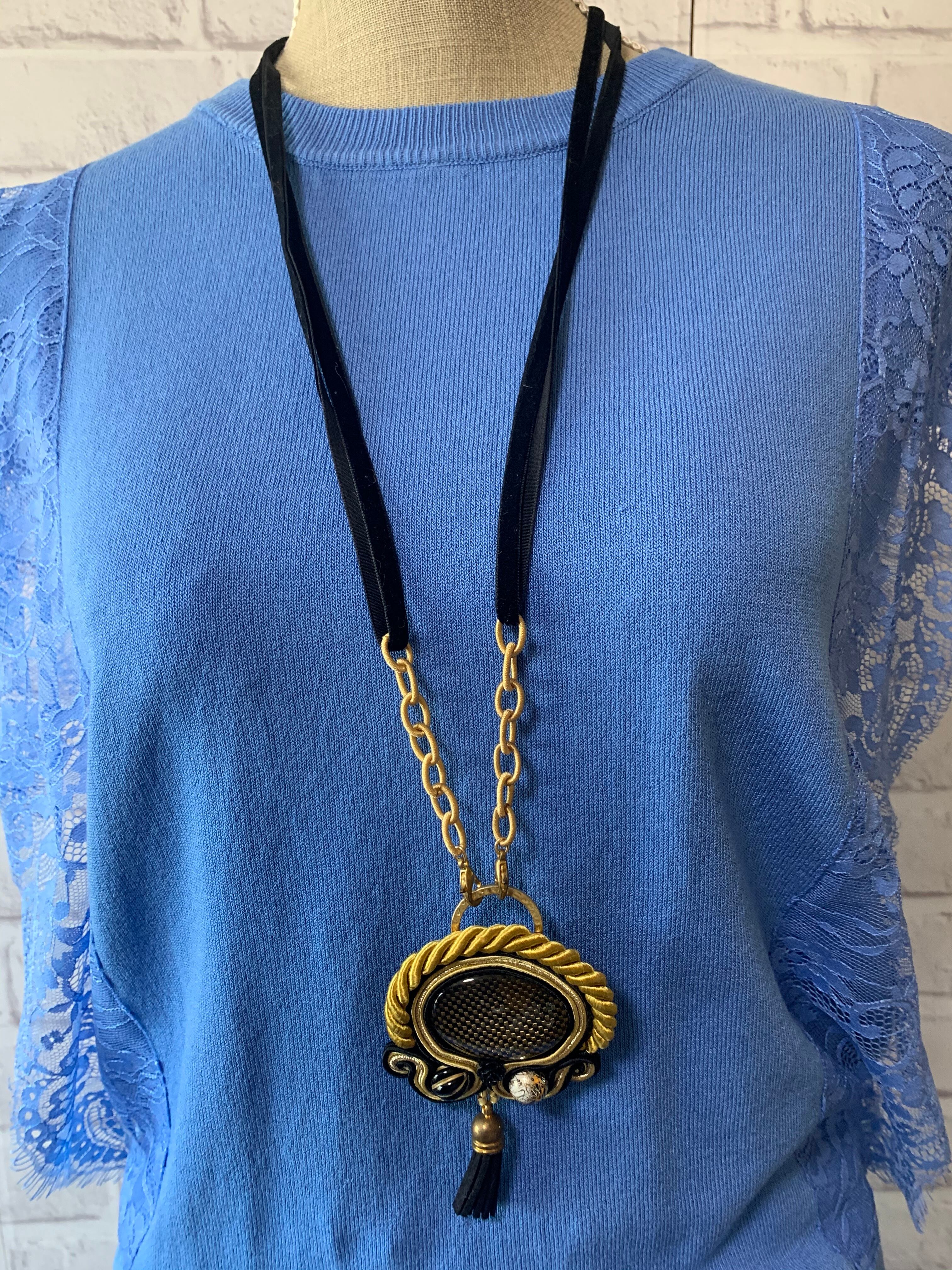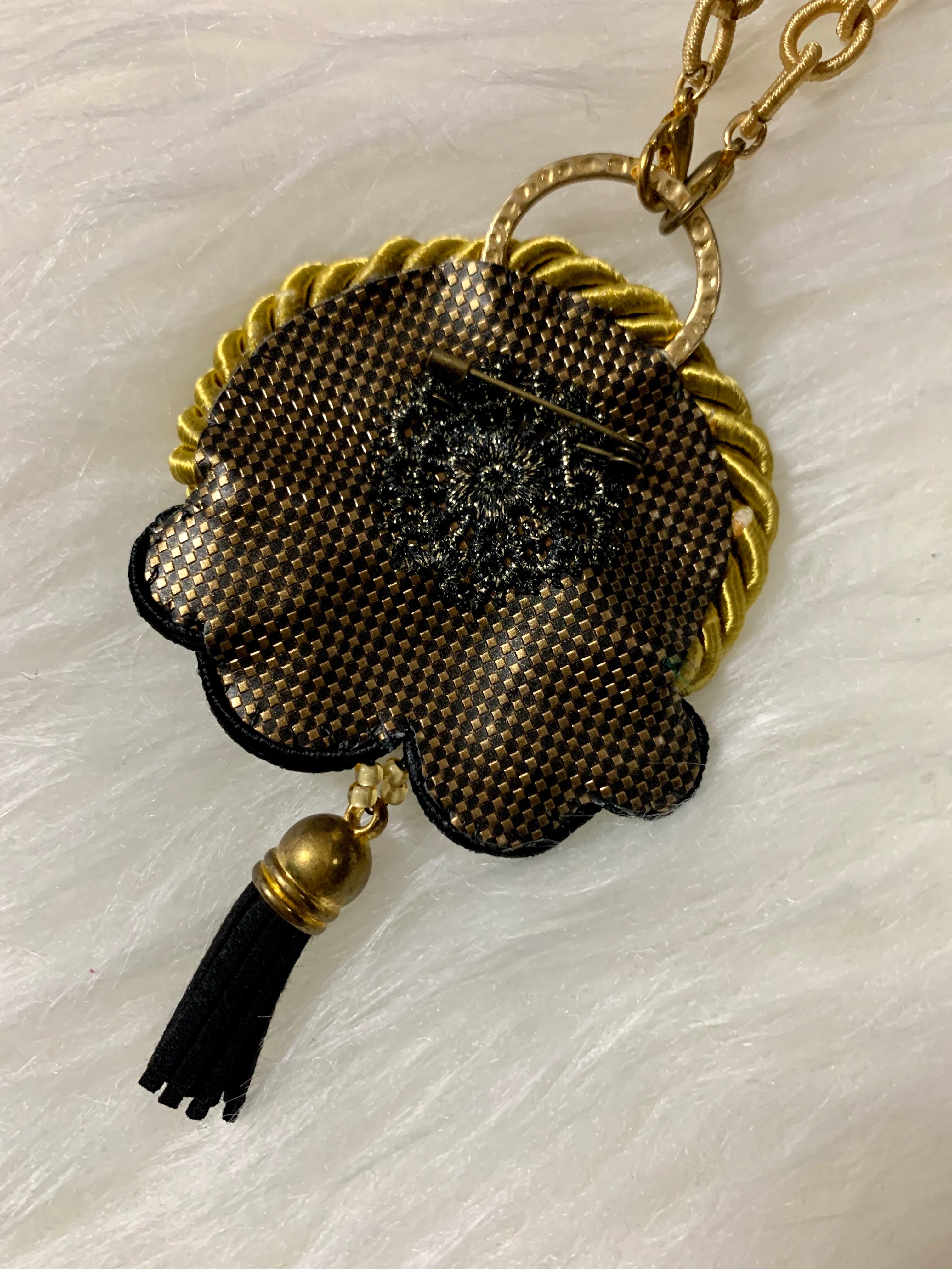 職人技ありの完全オリジナルハンドメイド。ハイクオリティーで丁寧な仕上がりとお洒落なデザイン性は他にない1点ものです。首のロープ部分はスゥエード素材。後ろでリボンにできるのでお好みの長さに調整可能です。ペンダントトップはブローチにもなります。