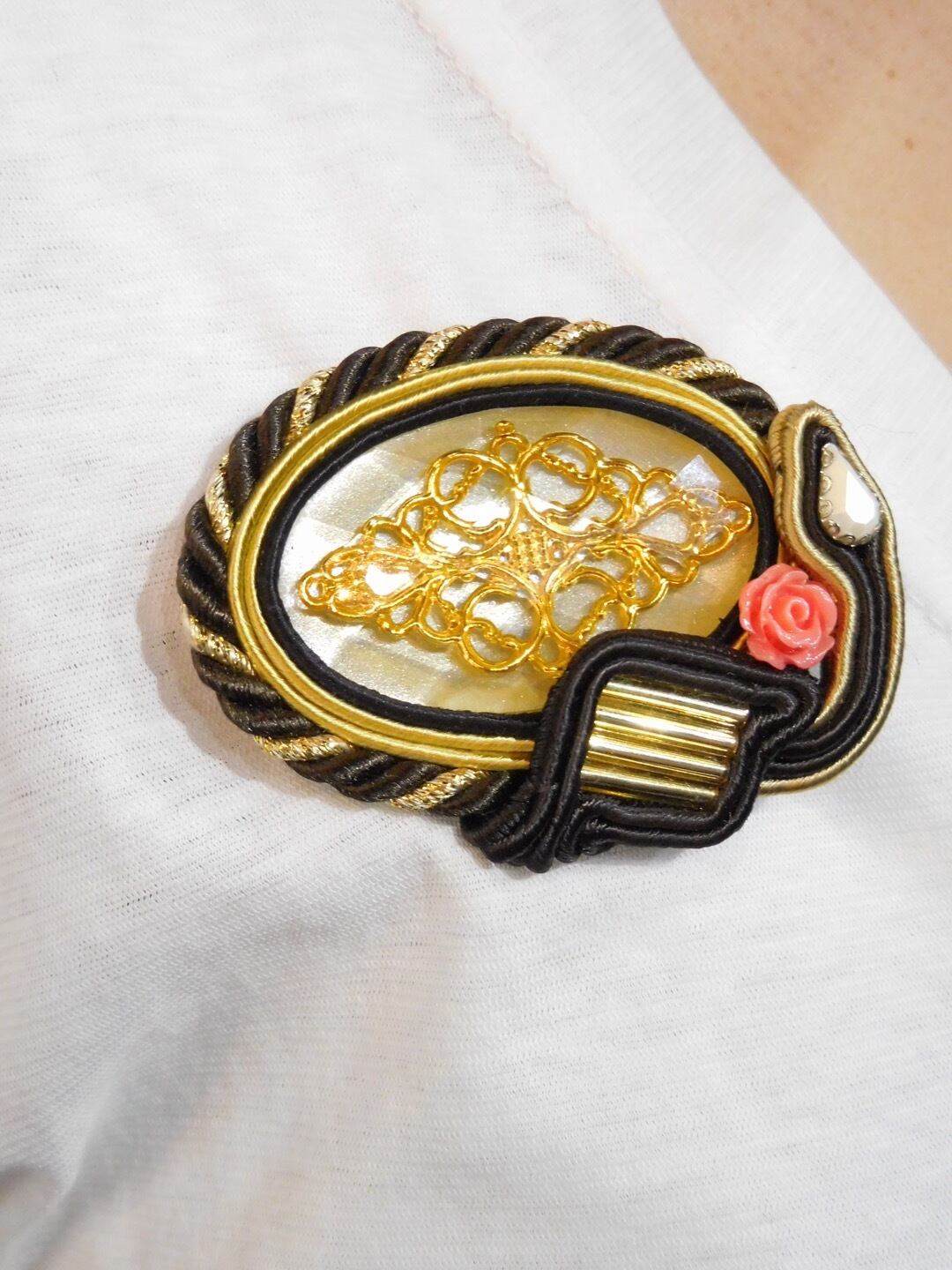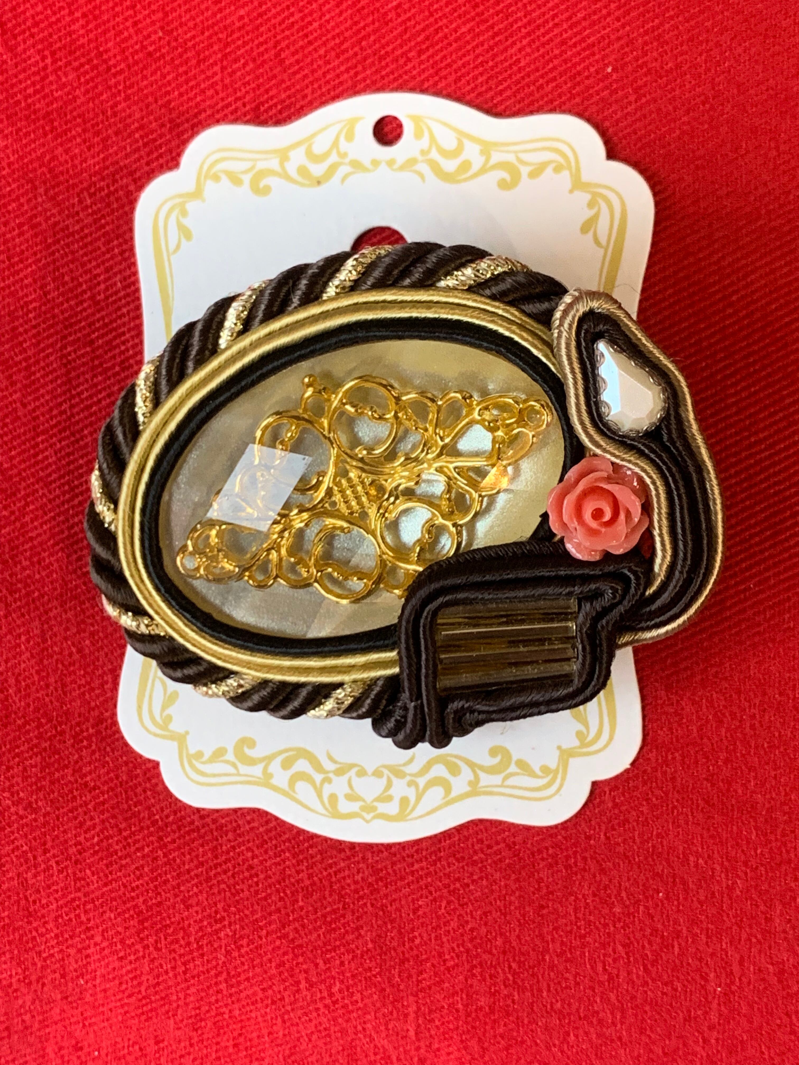 職人技ありの完全オリジナルハンドメイド。丁寧な仕上がりとお洒落なデザイン性は他にない1点ものです。バッグやスカーフ、帽子に留めても可愛い!!