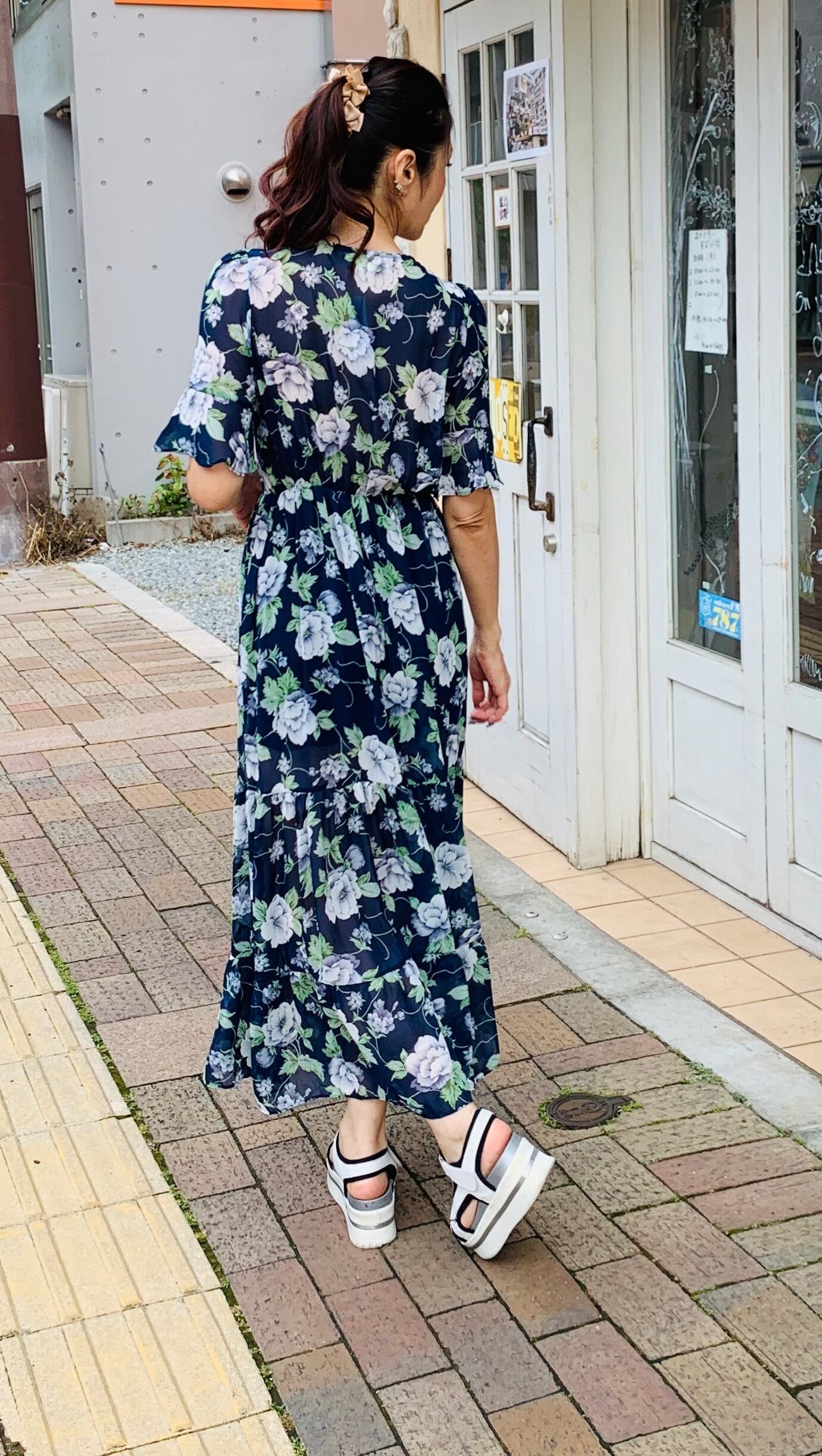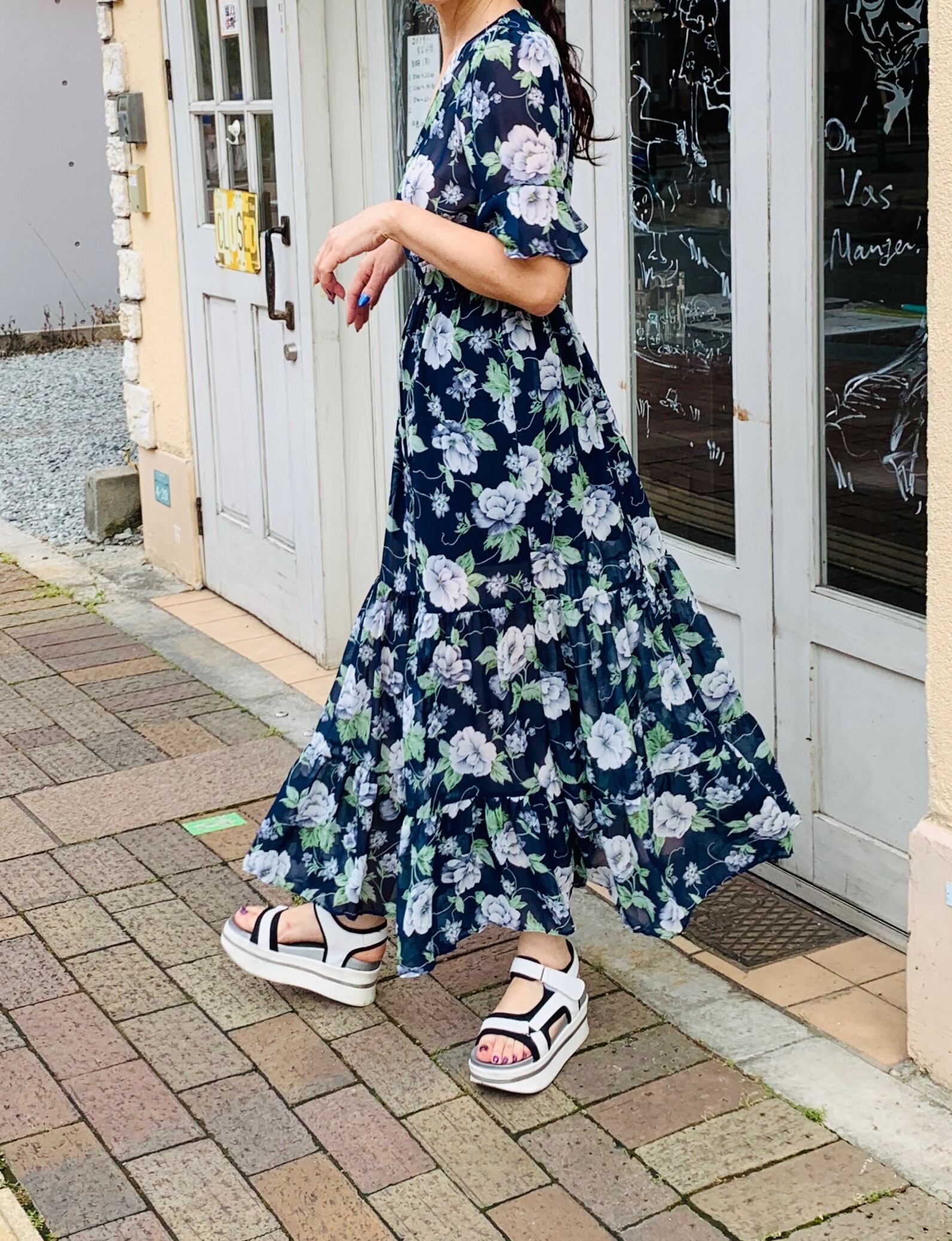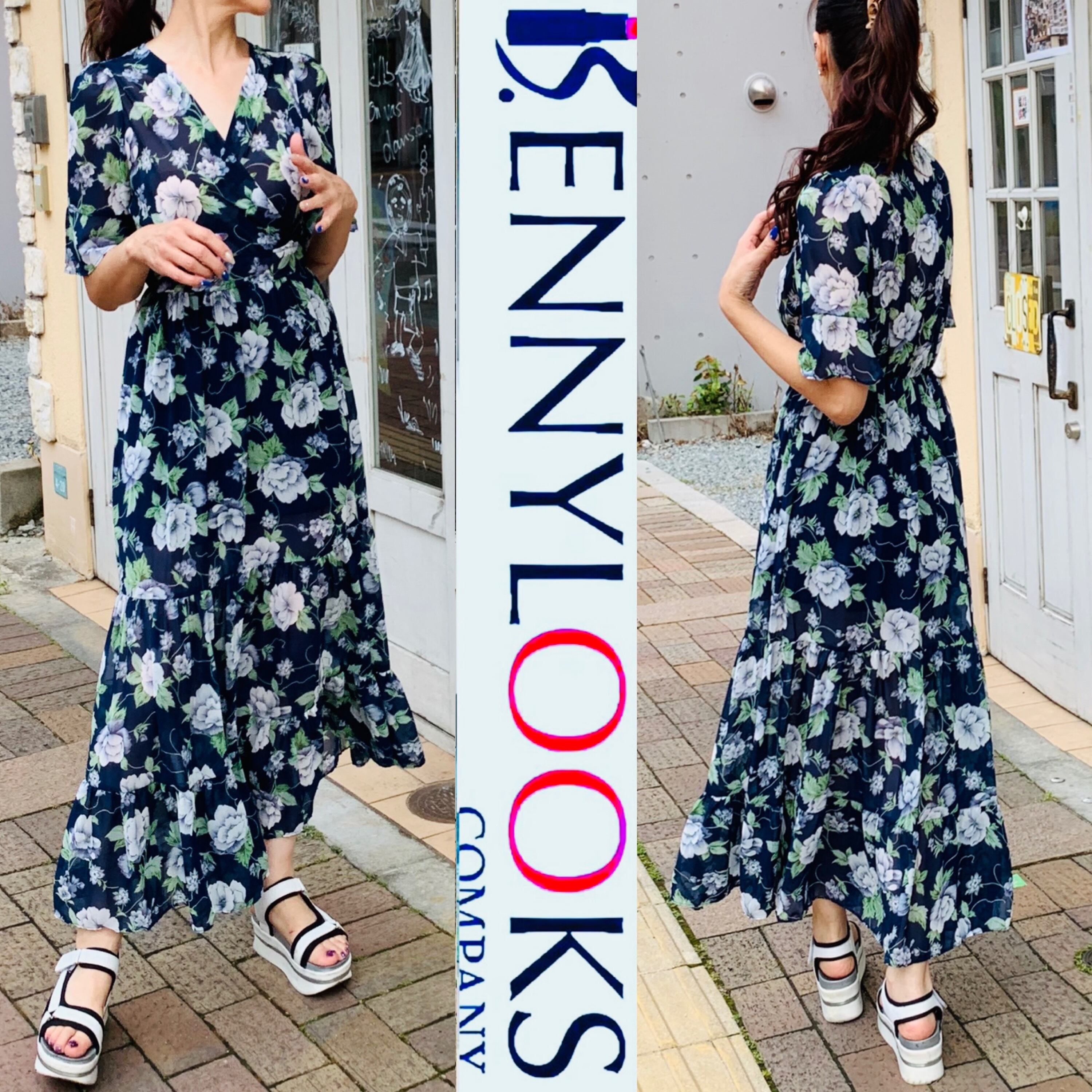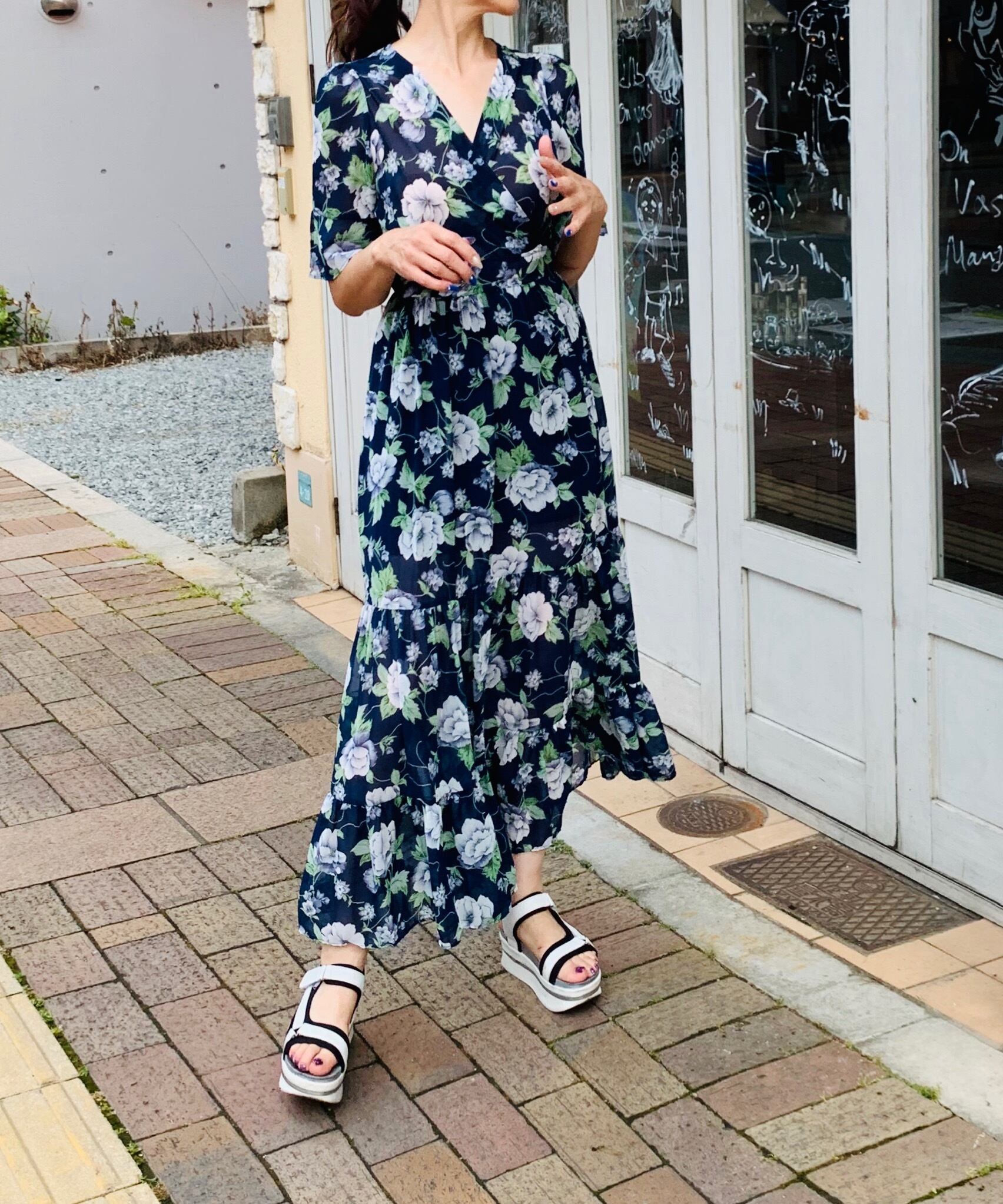 Vネックの花柄ロングワンピース