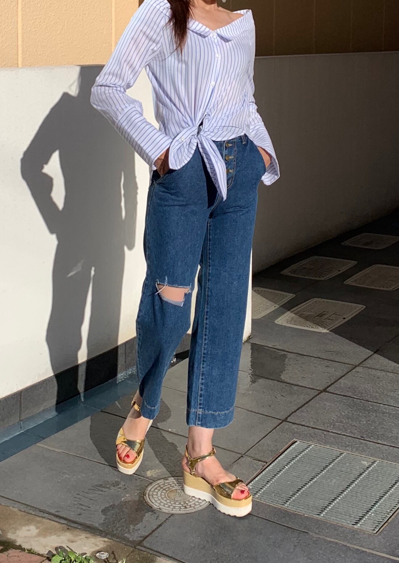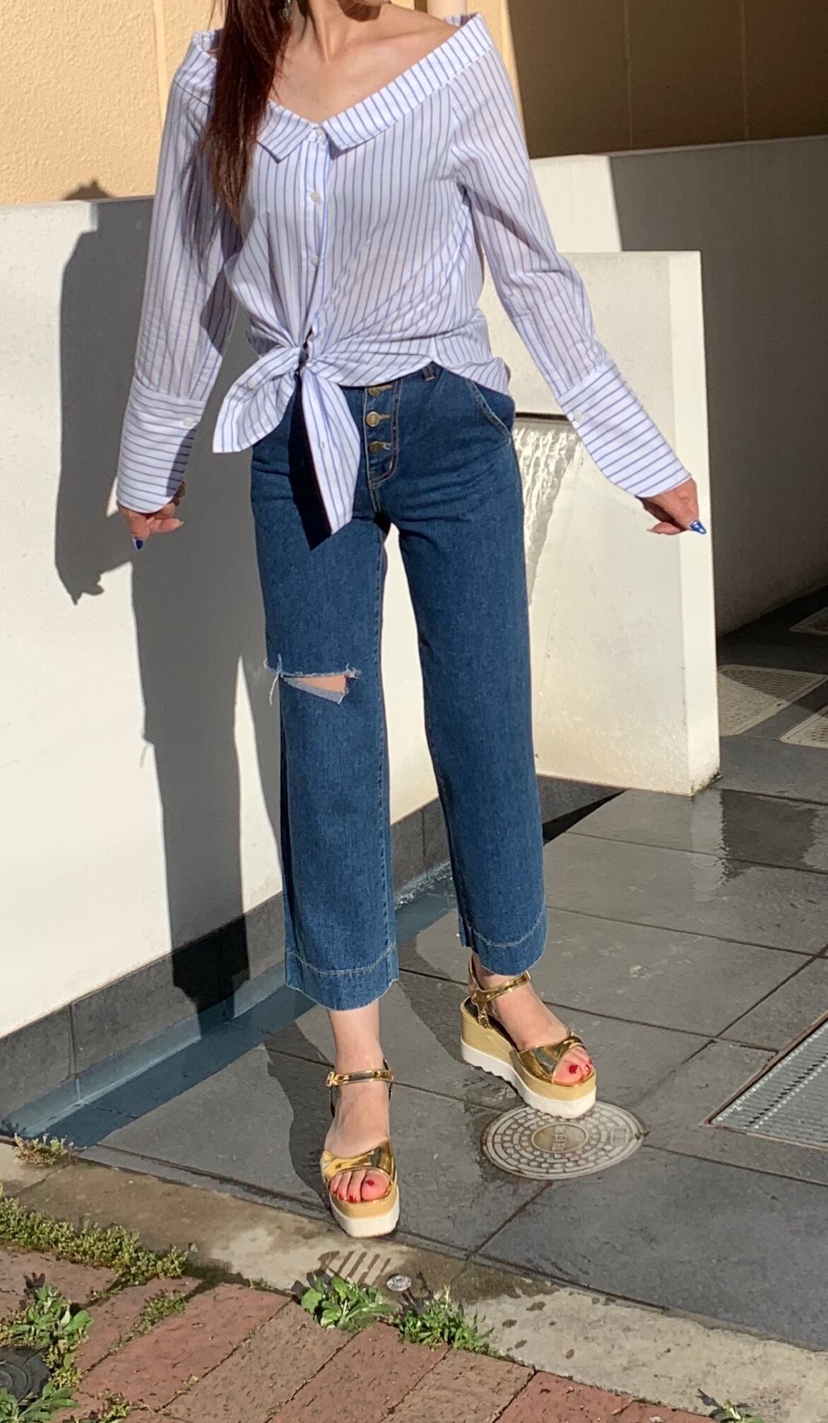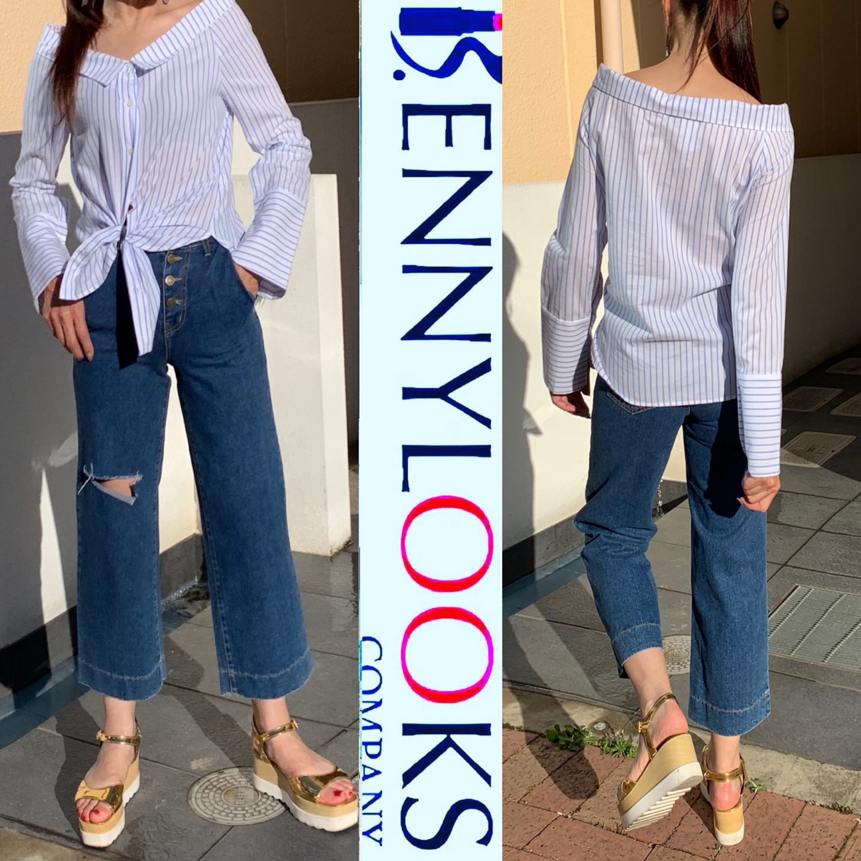 ストライプが涼しげで可愛いオフショルダーのシャツです。デニムとの相性もばっちりです。