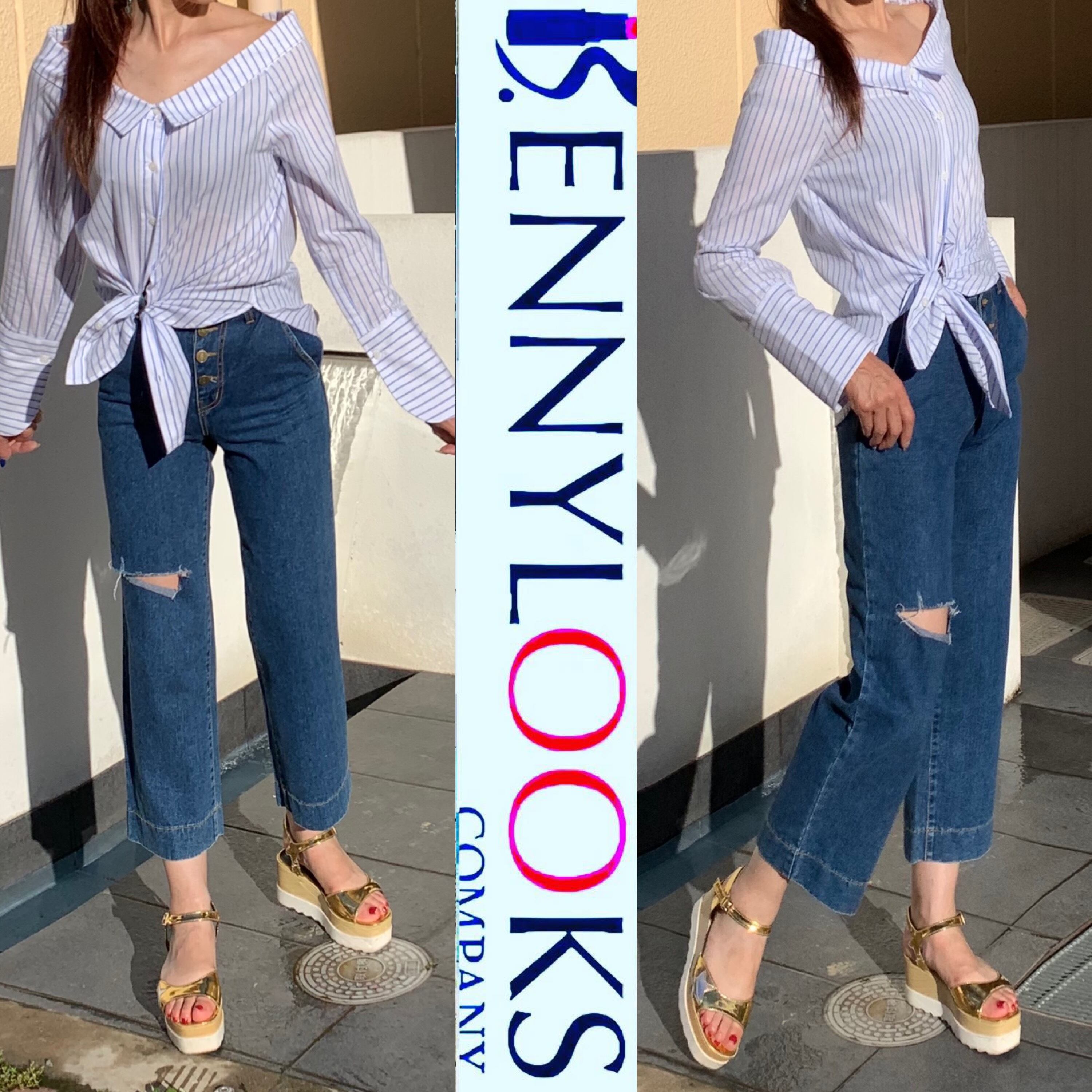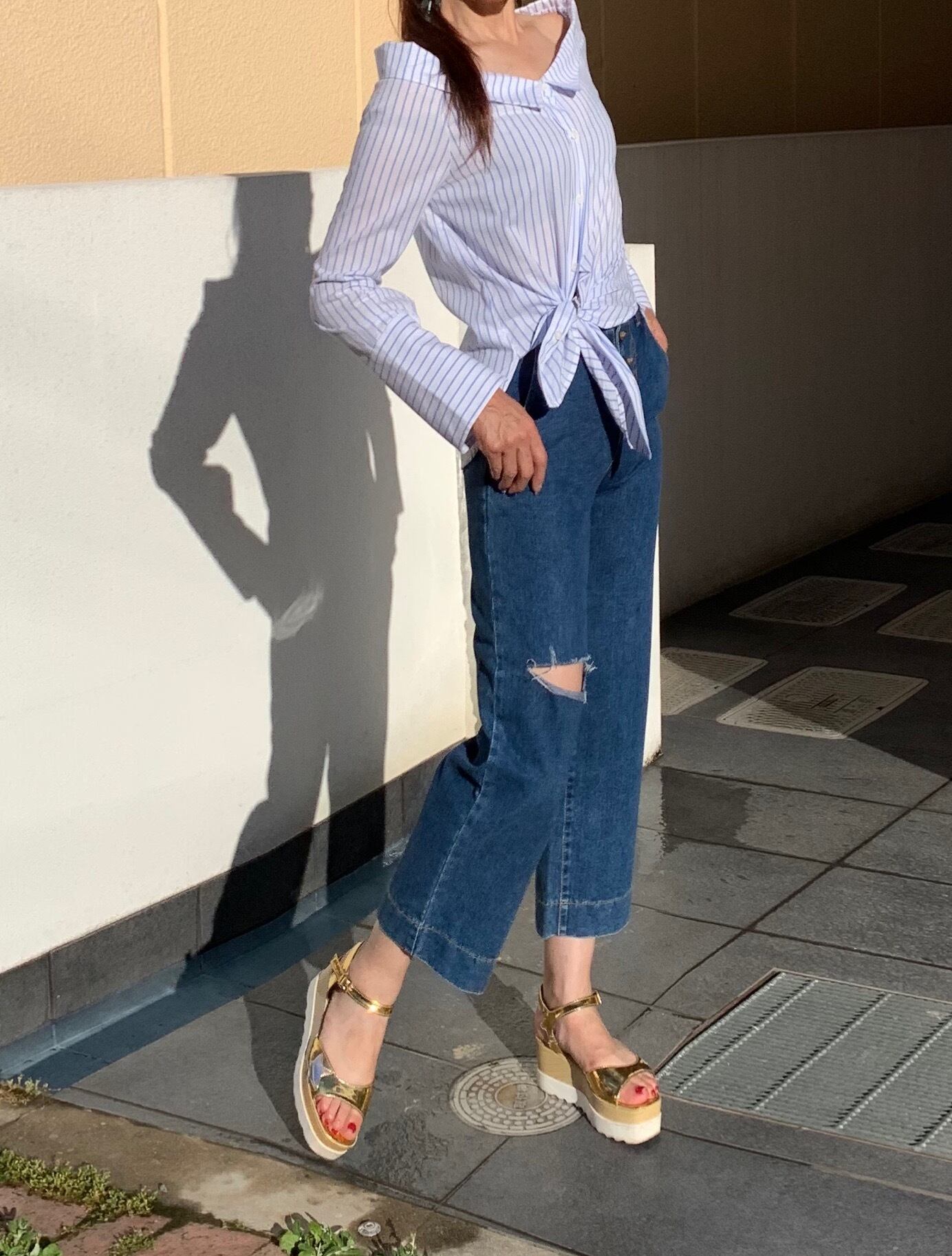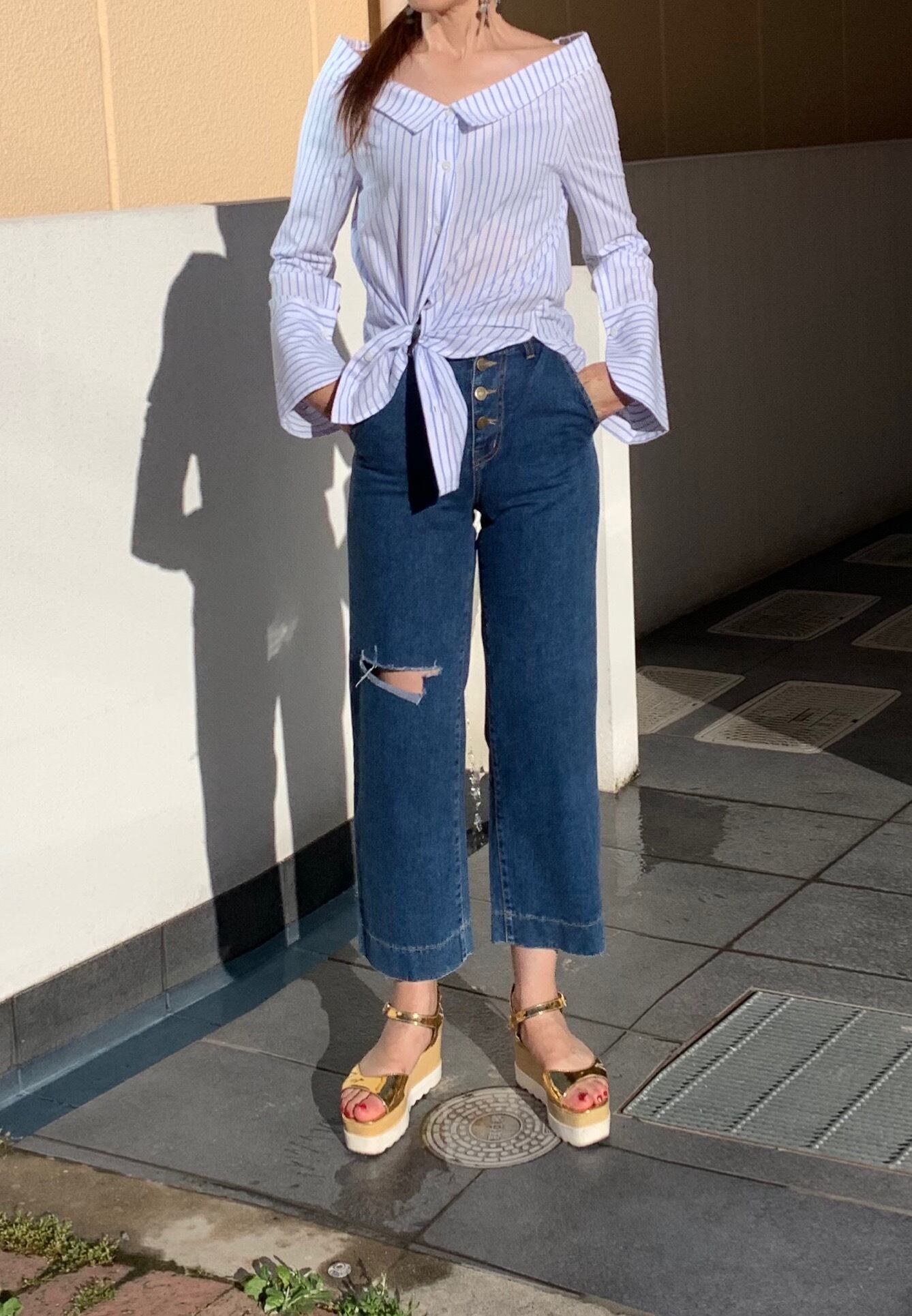 ストライプが涼しげで可愛いオフショルダーのシャツです。デニムとの相性もばっちりです。