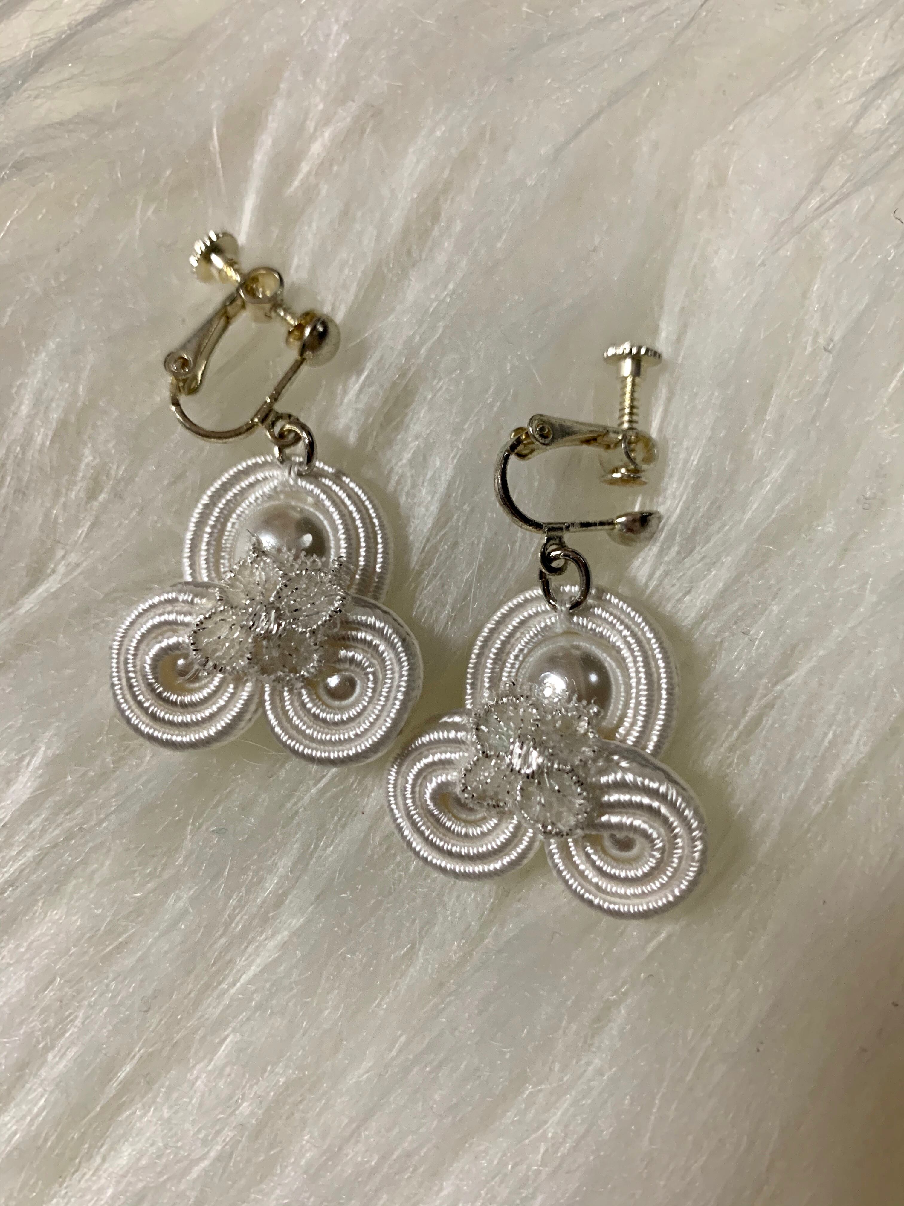 こちらの商品は作家さんによるハンドメイドで他にはないハイクオリティーで完全オリジナルのイヤリングです。コットンパールが清楚な雰囲気を存分にアピール。