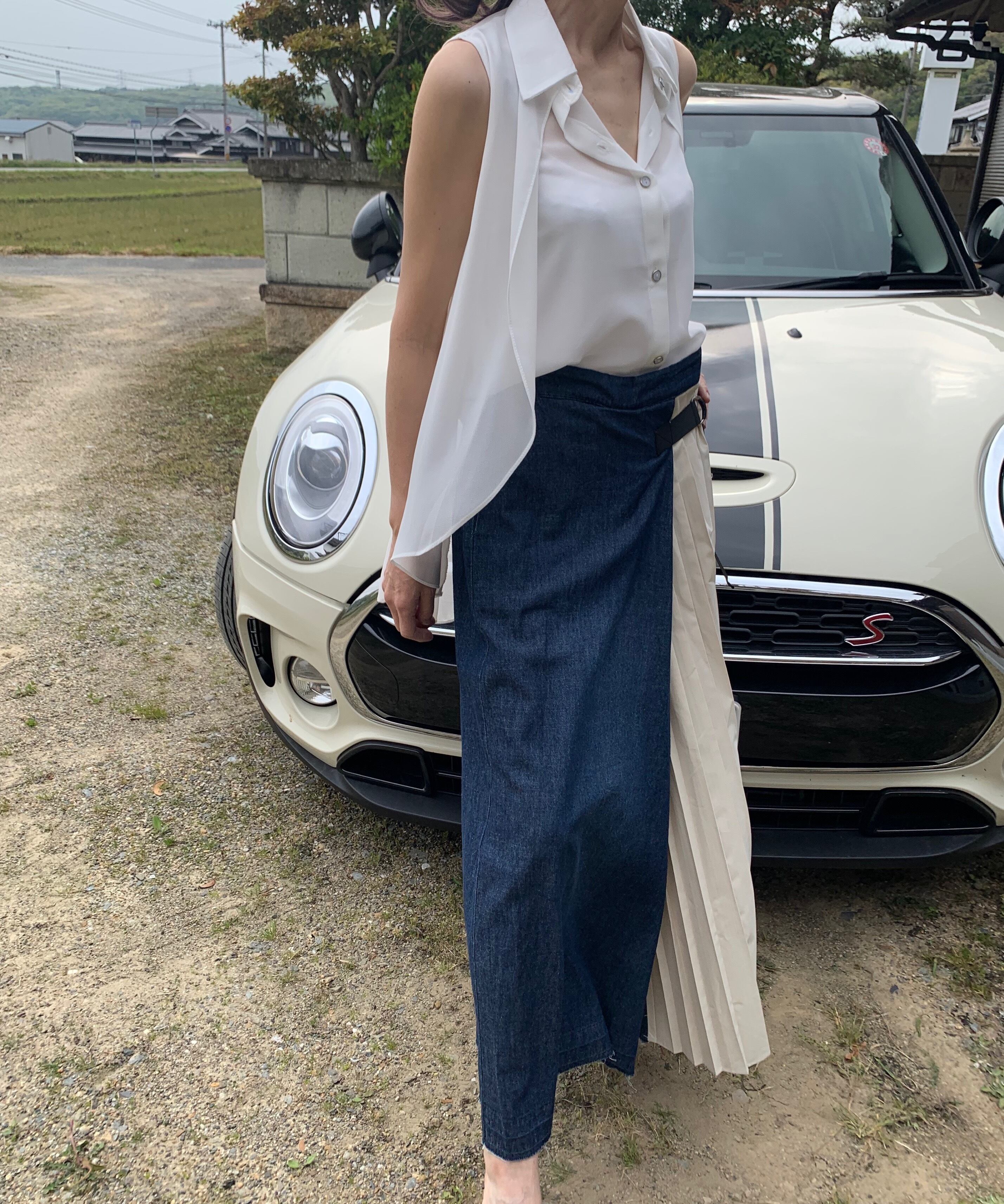 デニム✖️ギャザー異素材ドッキングワイドパンツ