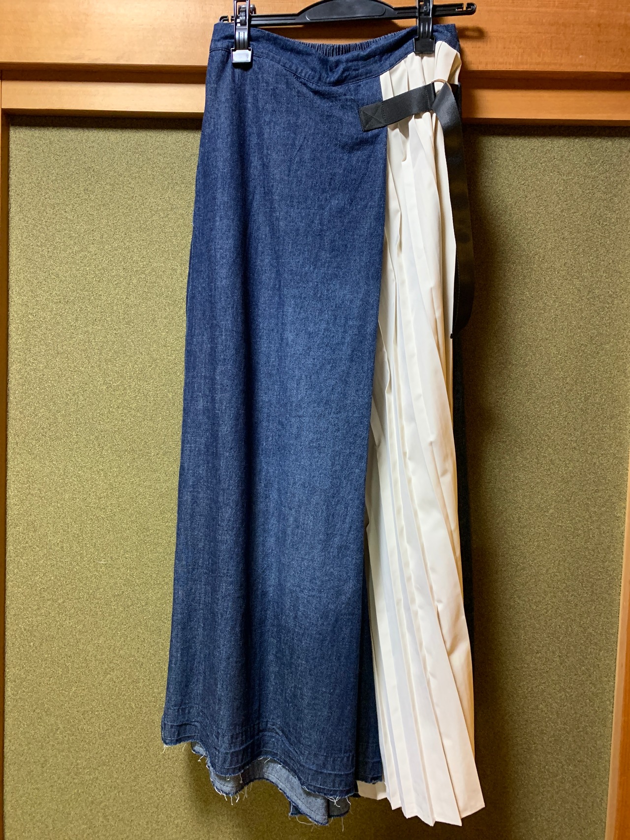 デニムとギャザーの組合せが斬新なワイドパンツです。